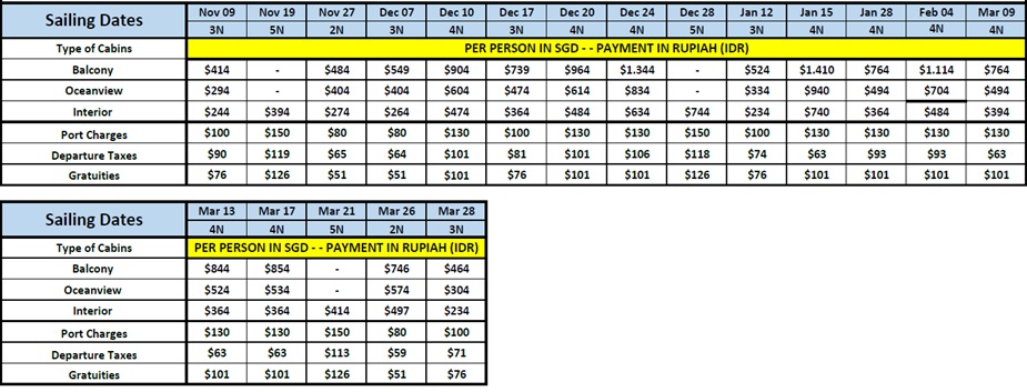 -All prices stated are for per person in Singapore dollars, subject to associated taxes and surcharges, correct at time of print and subject to change without prior notice.